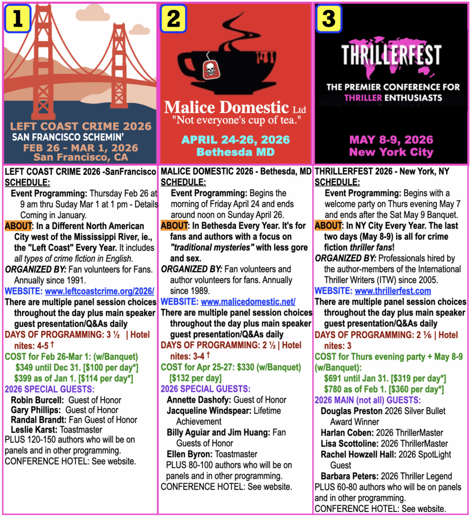 - 3) THRILLERFEST. Expect over 1,000 attendees. For fans, it is the shortest (2 days). It is the closest (NY city). It tries to focus on “thrillers” of all types, and crime fiction thrillers are at the top of the list. But the per day cost is the highest.