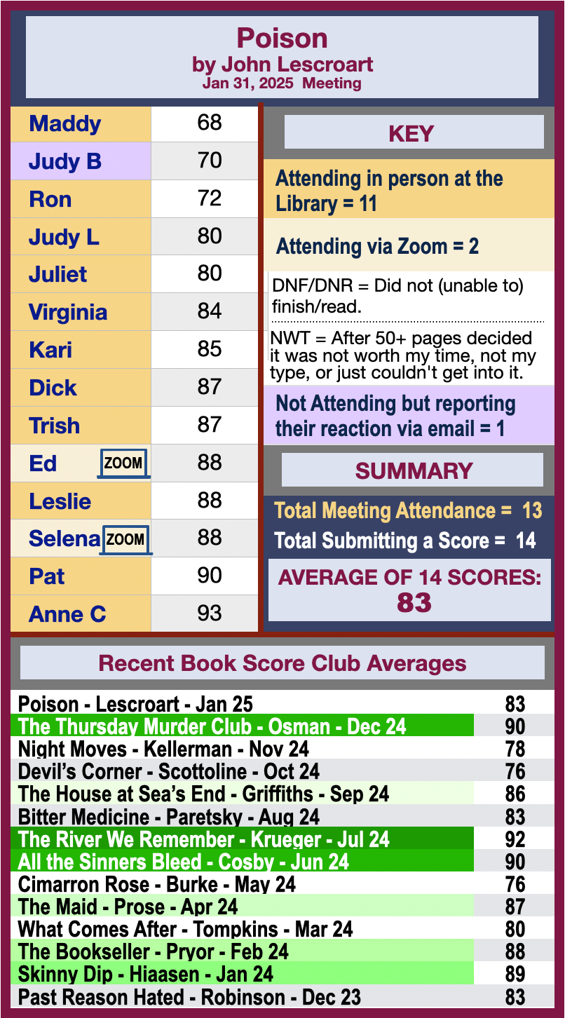 Please write your book reactions (and score if not reported above) where it says “LEAVE A REPLY,” below. You can also [nicely] comment on any other participant’s thoughts.
