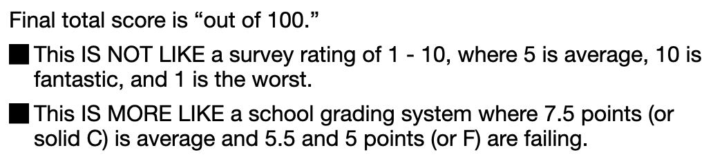 When you report your score for the group, so that we can compute an average score for the book, do not give a “fail” lower than a “50.” Anything lower would unfairly impact the overall group average. “50” is the worst score to give. If your total comes out less than 50, please adjust your total to 50.