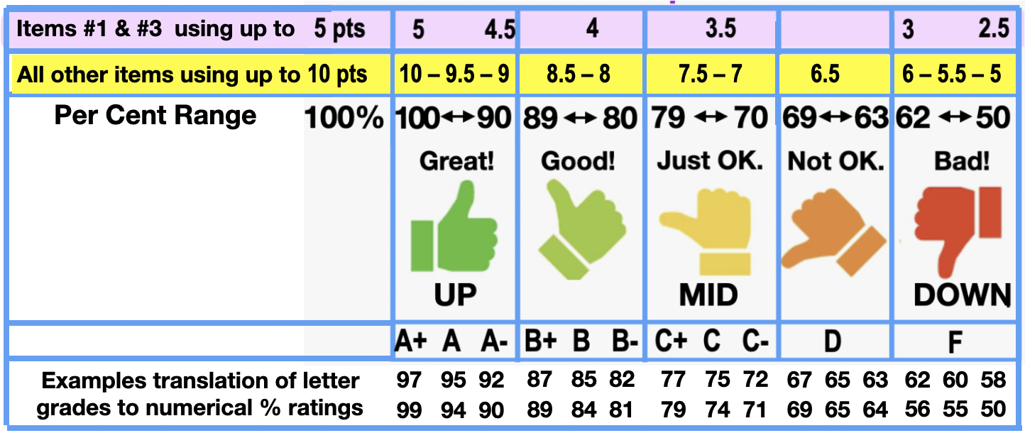 So, except for evaluation items #1 and #3, most items have a total value of 10 points. Grade like a school grade; let the following guide you: