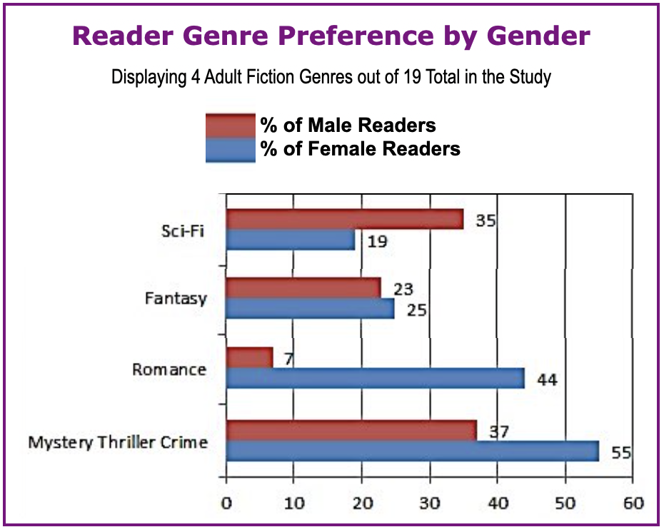 A blog post by D. Wallace Peach reported data she saw on Statista. The data is based on a 2015 survey of 2,273 US readers. She states, “The survey asked readers to identify the type of books they’ve read in the last year by genre. (Note that this is a survey of interest not volume. So, someone who reads 20 romances and 1 fantasy novel will check both boxes “yes.”) As with all surveys, take this one with a pinch of salt).” Some of the results are shown here:8