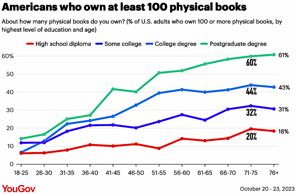 - “How many books Americans own — and how they organize them” by David Montgomery, at YouGov – US, https://today.yougov.com/society/articles/47712-how-many-books-americans-own-and-how-they-organize-them ↩︎