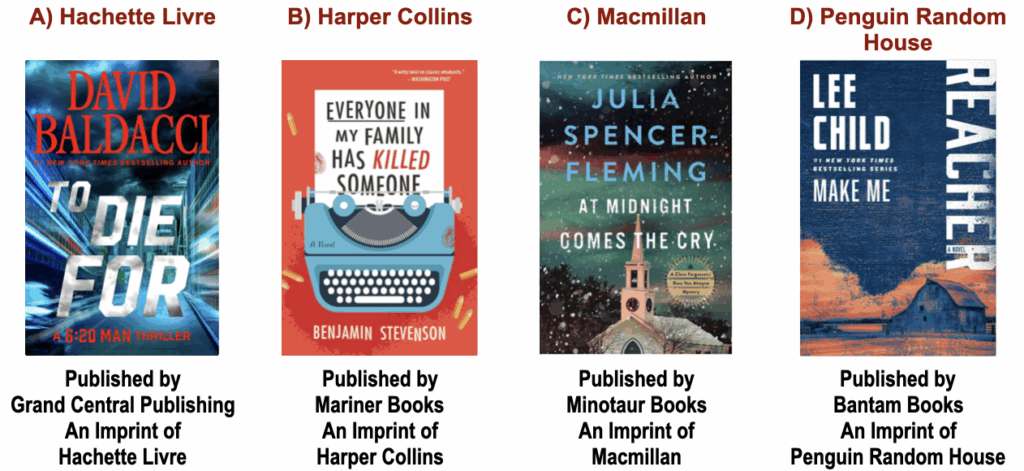 Q # 8: Of the “Big Four” in publishing fiction, which makes the most money? (These publishing behemoths are listed in alphabetical order, with one of their many published crime fiction books, in parentheses.)
