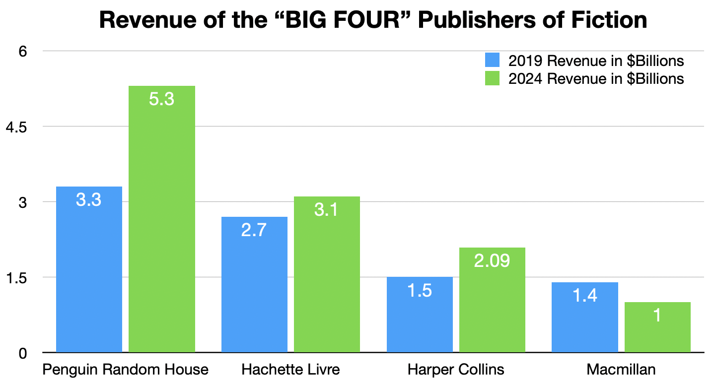 Below is a chart for revenues in the so-called “Big Four” of the publishers that put out books for the general public to purchase and read – as opposed to textbooks, catalogs, and other printed materials. Because Macmillan is not a public company, it is not required to report revenues, so those figures, especially for 2024, are estimates.9
